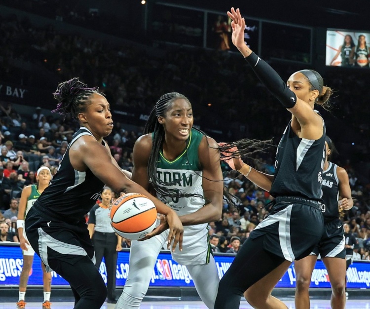 作为联盟中的传统强队,拉斯维加斯王牌在首轮遭遇了西雅图风暴的顽强抵抗。系列赛首战,王牌展现出强大的统治力,以102-77的悬殊比分大胜风暴,阿贾-威尔逊全场砍下29分8篮板,杰基-杨也有18分7助攻入账,王牌凭借出色的进攻效率和强硬的防守,早早确立了领先优势。