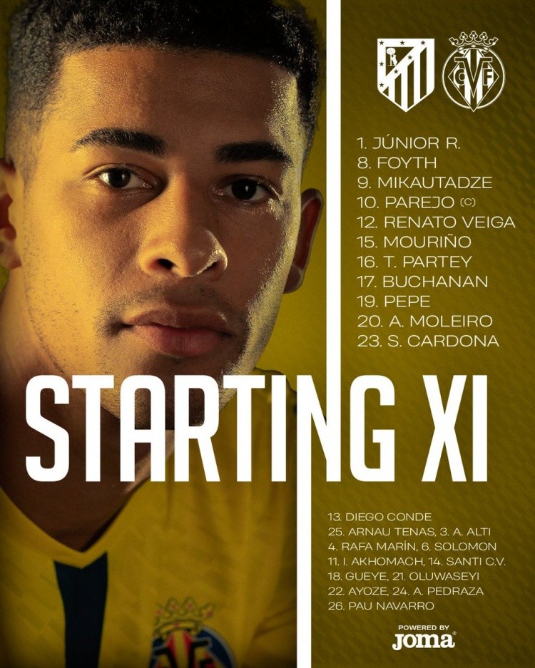 黄潜首发:1-路易斯-儒尼奥尔、8-福伊特、9-米卡乌塔泽、10-帕雷霍、12-雷纳托-维加、15-圣地亚哥-穆里奥、16-托马斯、17-布坎南、19-尼古拉-佩佩、20-莫莱罗、23-卡尔多纳